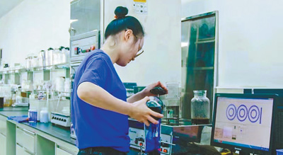 时兴纺整(苏州)有限公司实验室内,员工正在进行酸性染料化料操作。